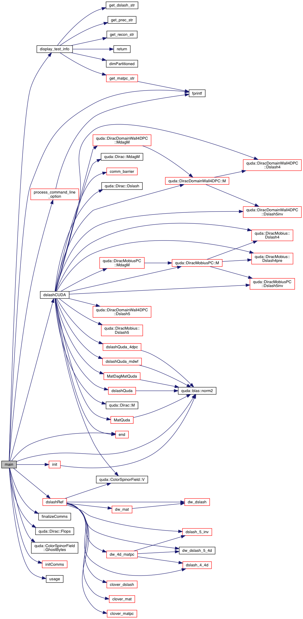 References comm_barrier(), DslashTime::cpu_max, DslashTime::cpu_min, DslashTime::cpu_time, cudaSpinor, cudaSpinorOut, dagger, dirac, dirac_4dpc, dirac_mdwf, quda::Dirac::Dslash(), quda::DiracDomainWall4DPC::Dslash4(), quda::DiracMobius::Dslash4(), quda::DiracMobius::Dslash4pre(), quda::DiracDomainWall4DPC::Dslash5(), quda::DiracMobius::Dslash5(), quda::DiracDomainWall4DPC::Dslash5inv(), quda::DiracMobiusPC::Dslash5inv(), dslash_type, dslashQuda(), dslashQuda_4dpc(), dslashQuda_mdwf(), end(), DslashTime::event_time, fused_exterior_ndeg_tm_dslash_cuda_gen::i, inv_param, kappa5, quda::Dirac::M(), quda::DiracDomainWall4DPC::M(), quda::DiracMobiusPC::M(), MatDagMatQuda(), MatQuda(), quda::Dirac::MdagM(), quda::DiracDomainWall4DPC::MdagM(), quda::DiracMobiusPC::MdagM(), niter, parity, printfQuda, QUDA_DOMAIN_WALL_4D_DSLASH, QUDA_MOBIUS_DWF_DSLASH, QUDA_TWISTED_CLOVER_DSLASH, spinor, spinorOut, start, test_type, tmp1, transfer, timeval::tv_sec, timeval::tv_usec, and quda::ColorSpinorField::V().